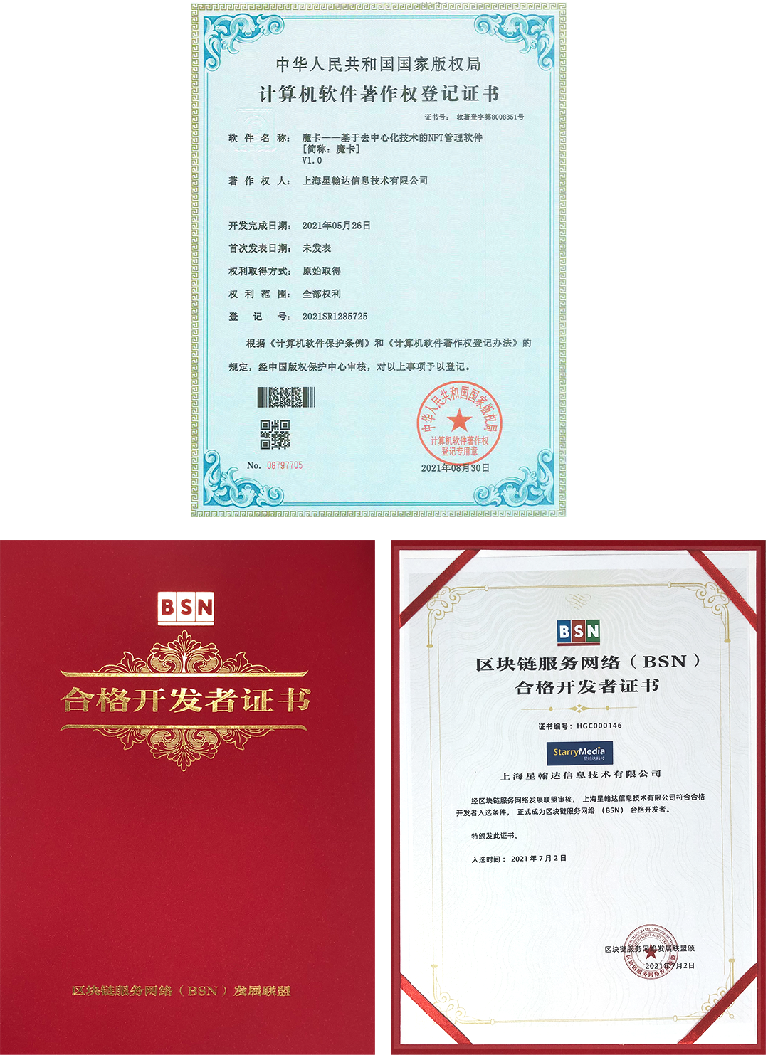 作为BSN以及基于BSN的开放联盟链OPB(文昌链)的核心合作伙伴,星翰达科技独自研发并拥有魔卡平台的全部知识产权。团队在平台支持和应用落地层面进行严格的合规性评估,支持所在地的商业运营。魔卡平台的技术载体为文昌链的底层区块链以及NFT模块,为用户提供资产的可信记载和管理。而支付载体包含各类法币通道,包括即将进入市场的数字人民币,适用于全球所有合规市场,尤其是巨大的中国市场。